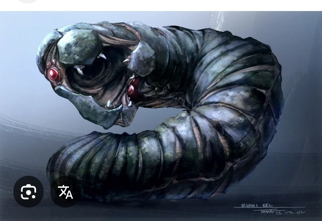 Appearance: Colossal, serpentine desert creatures, often brown or sandy in color, with multiple legs, armored plates, and a massive maw. They possess a distinctive dorsal fin.